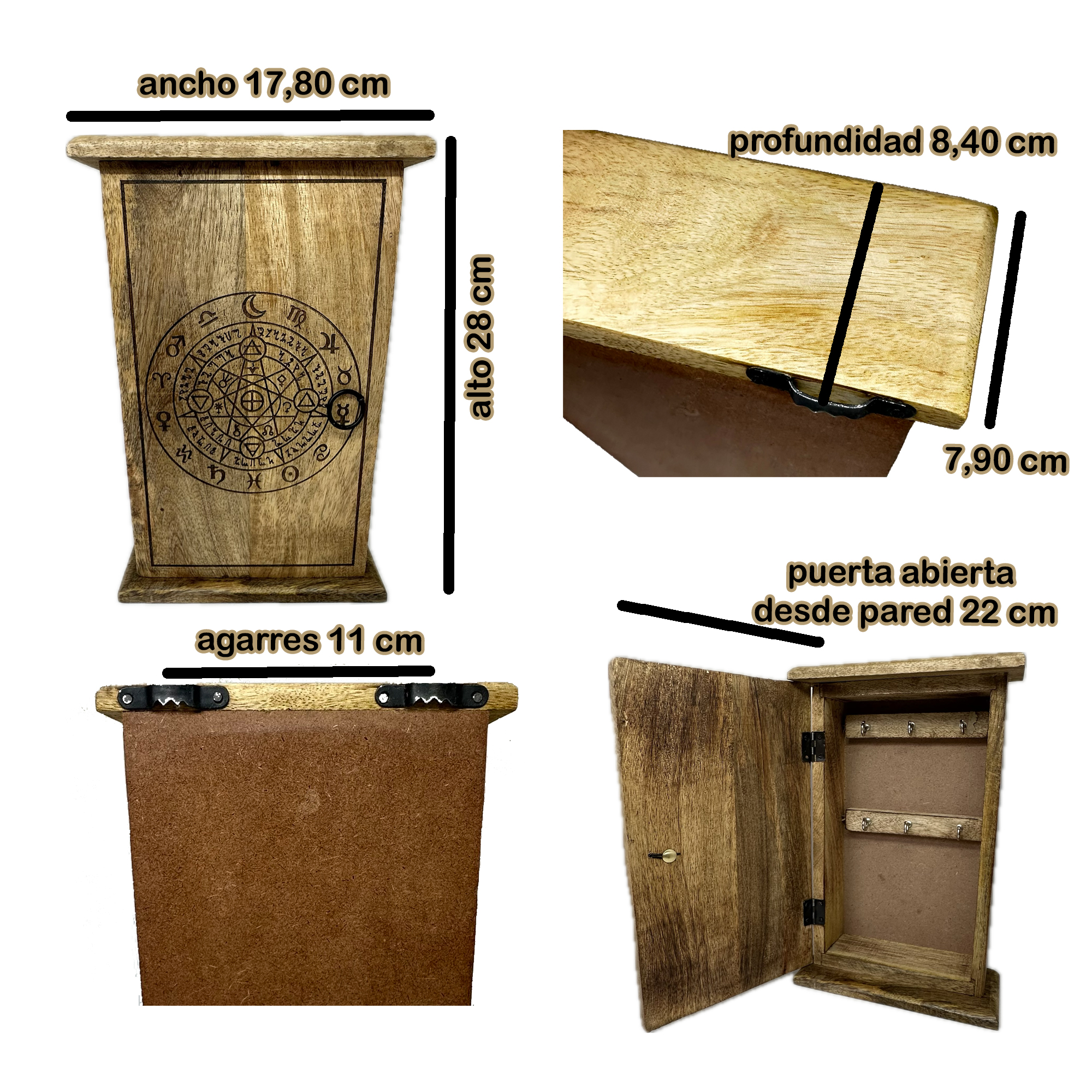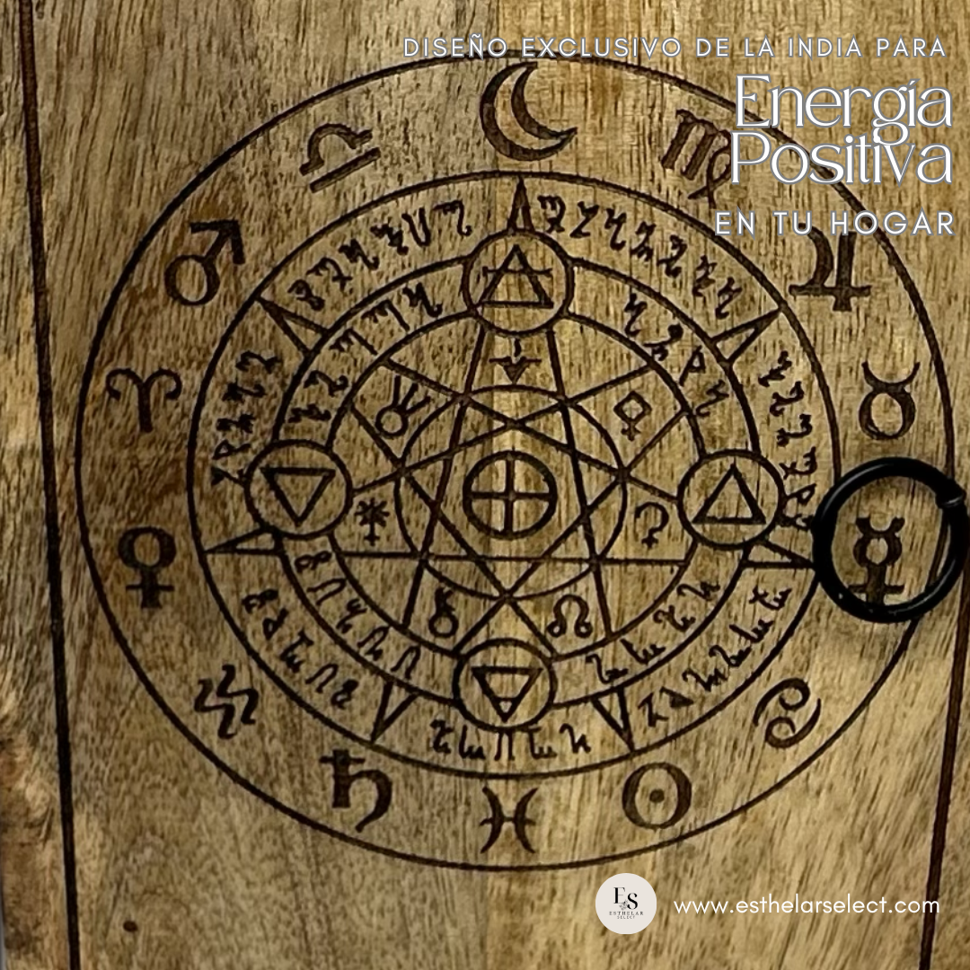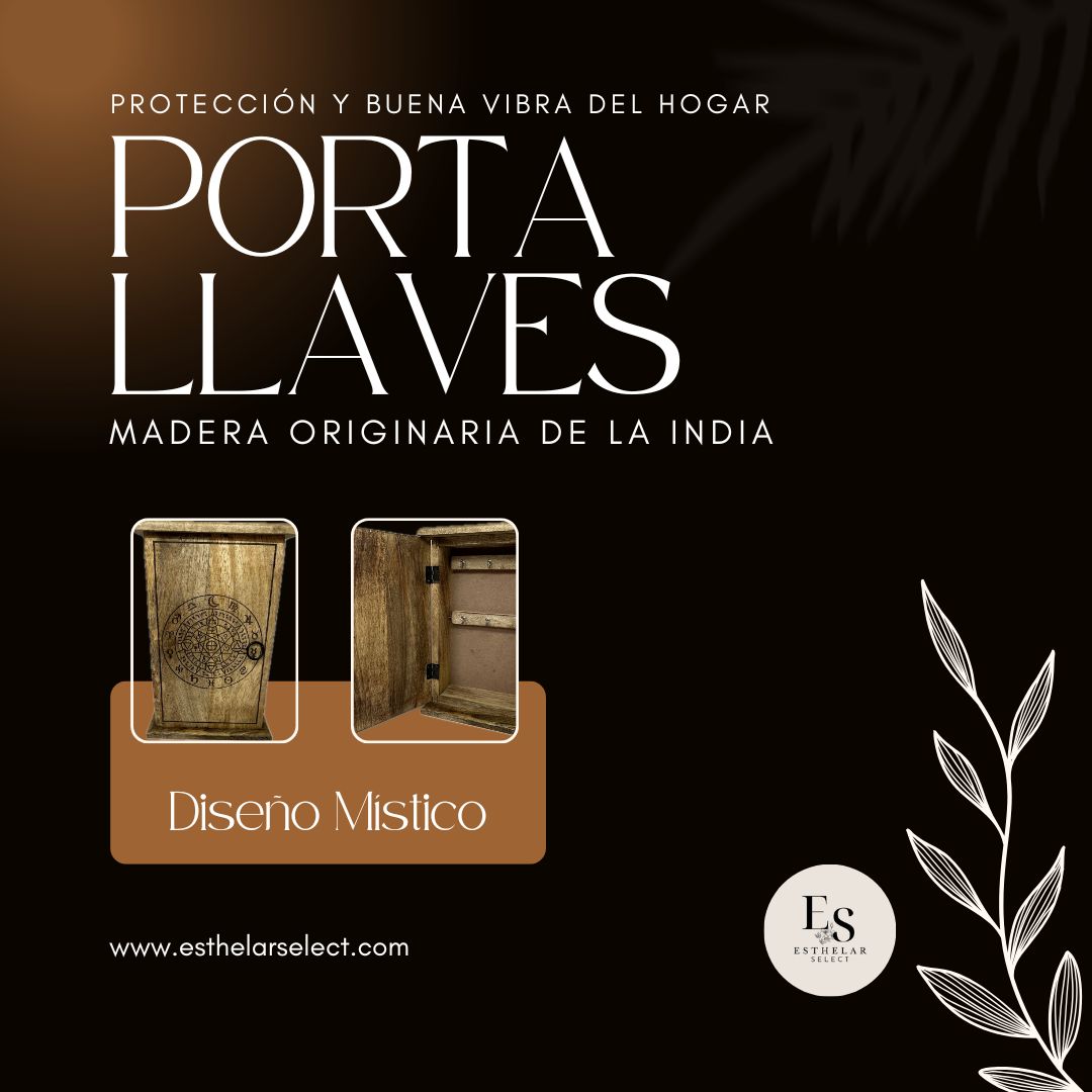 Esta caja portallaves procedente de la India está hecha en madera y es una pieza única y atractiva para tu hogar. Su construcción de madera maciza la hace duradera y resistente. Un accesorio funcional y decorativo para cualquier estilo. Dimensiones aproximadas: 18 x 8 x 28 cm. Instrucciones de cuidado: limpiar con un paño seco. Con capacidad para 6 llaves, mantiene tu espacio organizado. Este grabado místico de inspiración astrológica tiene un propósito decorativo que aporta protección y energía positiva al hogar. Sus símbolos evocan la conexión con fuerzas cósmicas y universales, ideal para quienes buscan un ambiente armonioso y equilibrado en su espacio. Colocar esta pieza en casa no solo añade un toque de estilo vintage, sino que también simboliza la atracción de energías beneficiosas y la promoción de un entorno sereno. Al ser un producto hecho a mano en la India, disponemos de muy pocos ejemplares sin tener fecha exacta de reposición del artículo. Dentro del porta llaves encontrarás un pequeño obsequio para que tu casa huela mejor. Que lo disfrutes.